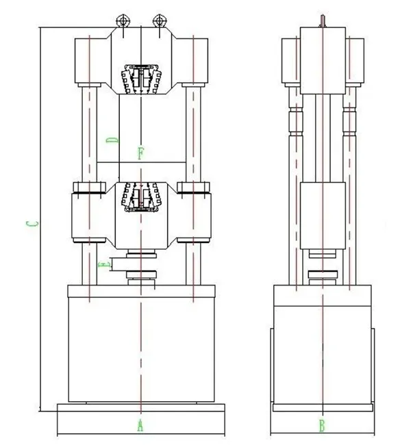 | Modelo | Dimensão total AxBxC,mm | Espaço de tração máximo D,mm | Espaço de compressão máximo E,mm | Largura de teste F,mm |