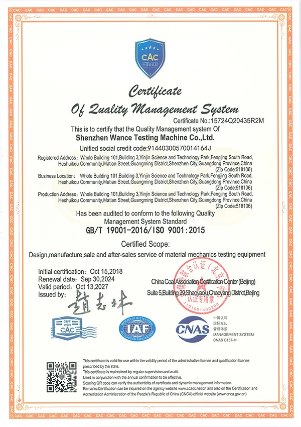 Fundada em 2011, a Shenzhen Wance Testing Machine Co., Ltd. é especializada no desenvolvimento e fabricação de equipamentos de ensaio mecânico por meio de suas instalações de pesquisa e produção em Shenzhen e Wuhan. Nossa base em Wuhan cobre uma área de quase 30.000 metros quadrados, oferecendo capacidade para apoiar a fabricação e entrega em grande escala.